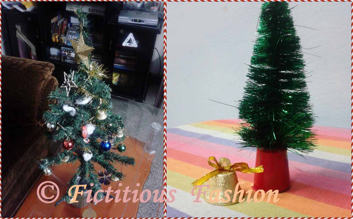| Christmas tree I decorated (left) and a small version of christmas tree that lies on my table, along with a bell! |